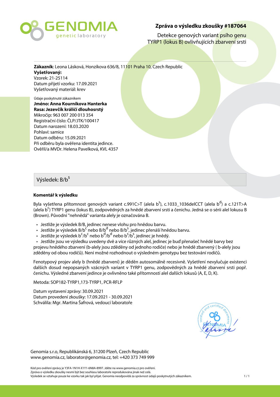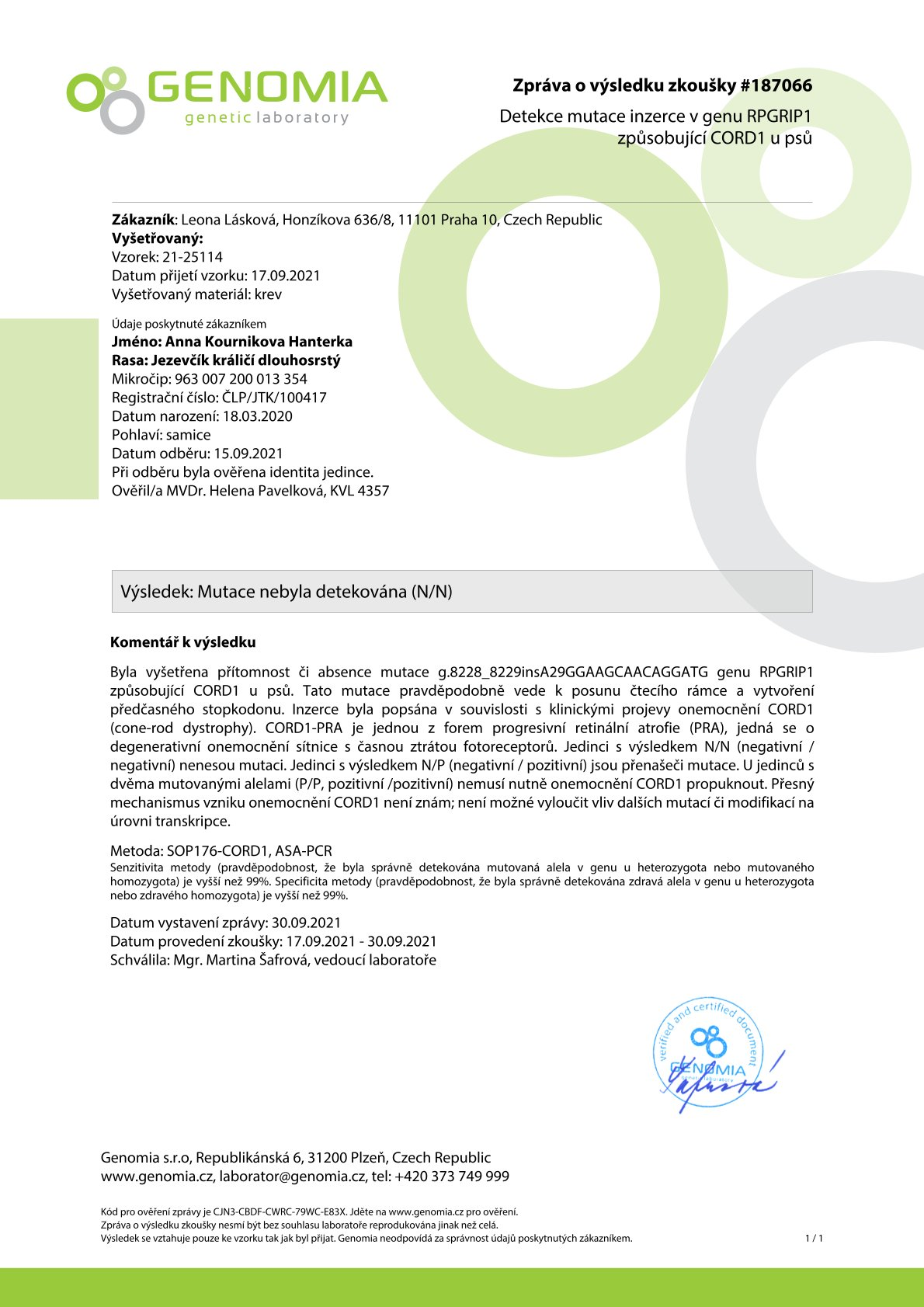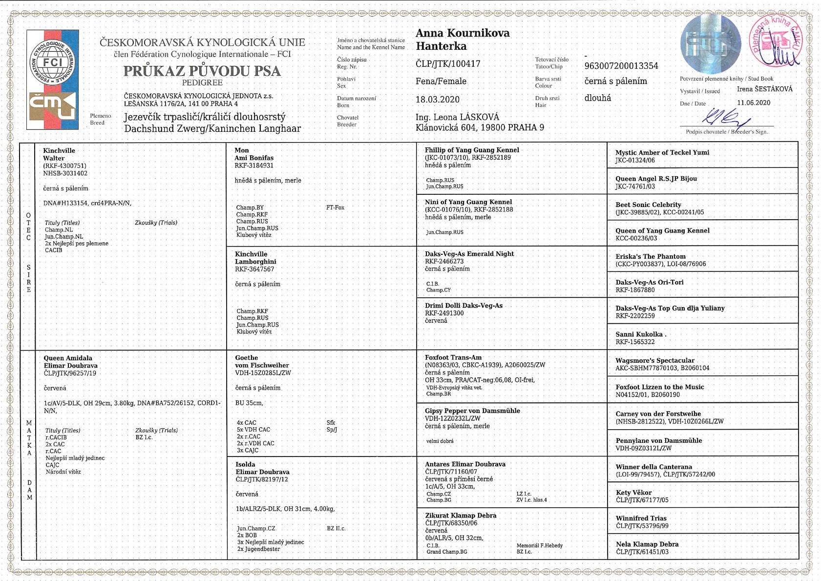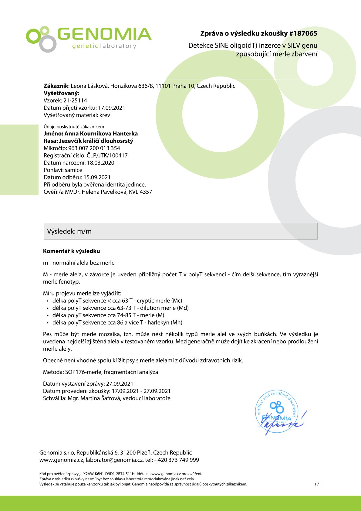 Genetika: m/m - merle prostá, B/b - nese gen pro hnědou barvu, N/N - CORD1 - PRA negativní - není přenašeč