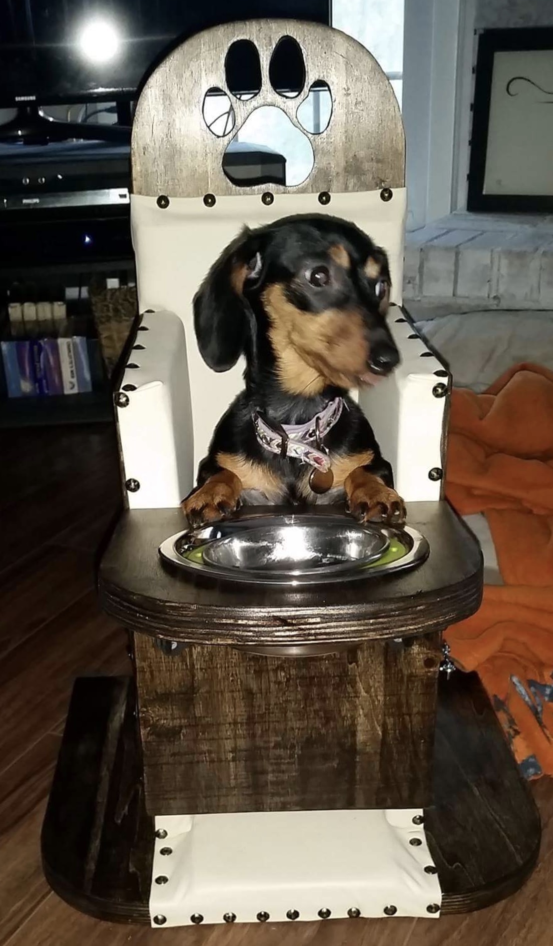 Abych dosáhla gravitačního účinku při krmení, dávala jsem misku se žrádlem na gauč, takže fenka žrala ve vzpřímené poloze, poté jsem ji ještě držela jako miminko, aby jí potrava gravitací sklouzla do žaludku. Také se používá Bailey Chairs viz obrázek níže.