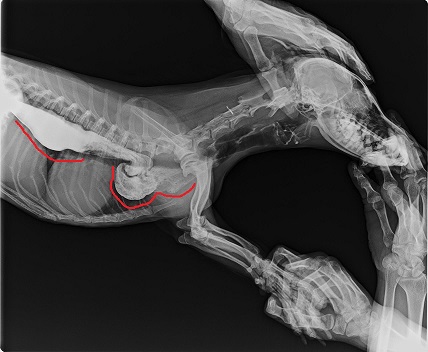 Jícen je vodorovná trubice, při Megaesophalu vznikají červeně vyznačené kapsy, kde se hromadí potrava, která se vrací zpět do tlamy. Zdroj: vlastní rentgenový snímek